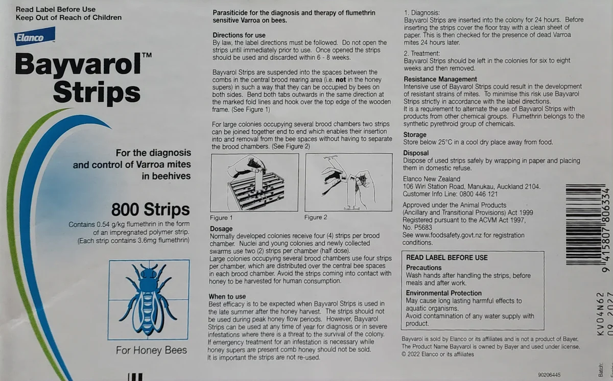 Bayvarol Strips are to be used at that time the mite population has not yet reached critical proportions and the bee colony hasn’t yet suffered any obvious damage. Ideally the strips should not be used during peak honey flow periods. However, Bayvarol can be used at any time of the year for diagnosis or in severe infestations where there is a threat to the survival of the colony.